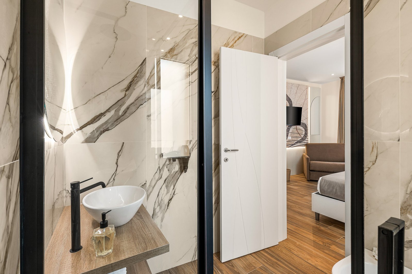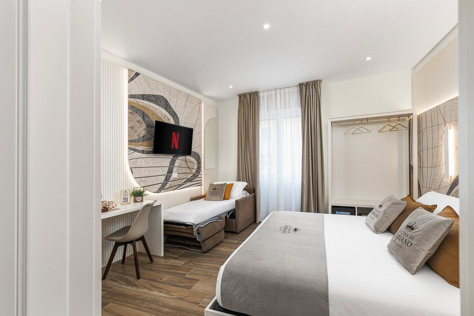 Accogliente camera con letto matrimoniale, divano letto aggiuntivo e bagno interno di ampie dimensioni, ideale per coppie, famiglie o per uso singolo.